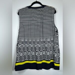 The Crown & Ivy Navyand White Sleeveless Blouse features a chic combination of classic stripes and pineapple patterns. This stylish blouse is perfect for warm weather, offering a comfortable and casual fit. The V-neckline with black trim adds a touch of elegance to this versatile piece.