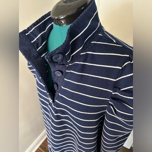 Navy sweatshirt with white stripes. Button-up collar. Long sleeves.