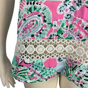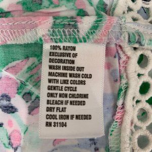 Pink/green/blue pattern with pom-pom and crochet accents. Sleeveless. Rayon.
