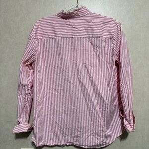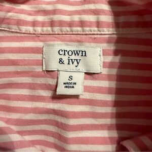 Crown & Ivy Womens Small Pink White Striped Cotton Stretch Ruffle Button Up Top in good used condition.  No stains, tears or rips.