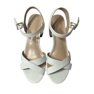 White leather crisscross straps. Round open-toe. Gold ankle buckle. 1-inch block heel. Regular size 8. Original shoebox included.