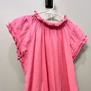 Cute pink top from Belk, never worn. Has ruffle/pleats around sleeves and neck. More of a high neck top. Can dress up or down!!