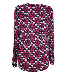 Crown & Ivy Shirt Womens Small Navy Pink Elephant Print Pleated Long Tab Sleeve