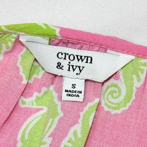 Crown & Ivy Small Seahorses Boho Poet's Blouse Tunic Top w Green Crochet Trim
