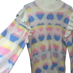 Crown & Ivy Sweater Small Hearts Ruffle Trim Pastel Knit Pullover oversized