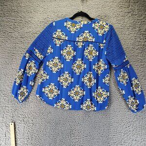 Crown & Ivy Top Women PXL Blue Floral Embroidered Long Sleeve Boho Blouse
