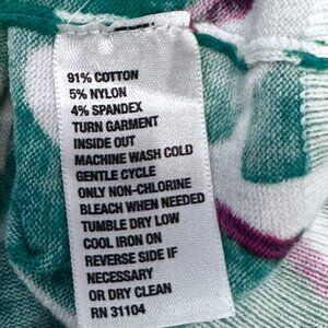 This vibrant cardigan by Crown & Ivy features a fun and playful pelican print in green, white, and pink hues. Made from a comfortable and stretchy blend of 91% cotton, 5% nylon, and 4% spandex, it is machine washable on a gentle cycle. With a button-up front and contrasting black trim, this cardigan adds a whimsical touch to any outfit while keeping you cozy. Suitable for casual wear or as a statement piece in a layered look.