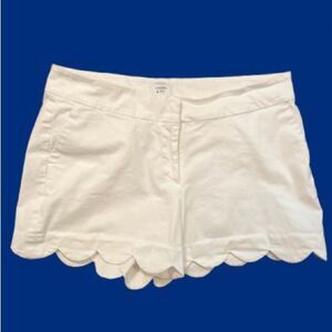 These high waist shorts from Crown & Ivy feature a crisp white color and a charming scalloped hem, offering a classic and summery look. Crafted from lightweight fabric, they provide a comfortable fit perfect for warm weather outings.