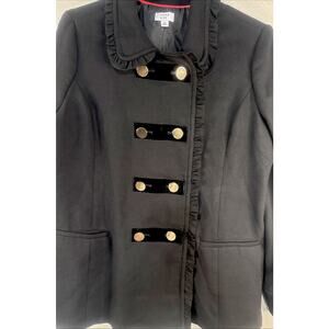 Crown & Ivy coat, women’s black jacket, double breasted, ruffle collar coat, XL black jacket, gold button coat, outerwear, career workwear jacket, dressy evening coat, office professional, long sleeve jacket, lined women’s coat, classic military style jacket, structured black coat, chic fall winter outerwear