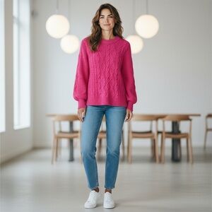 Bright pink cable knit sweater. Crew neck design. Perfect for casual wear.