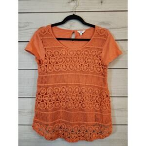 Crown & Ivy Women's Orange Crochet Short Sleeve Round Neck Blouse Petite Medium
