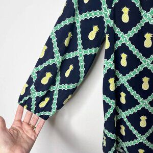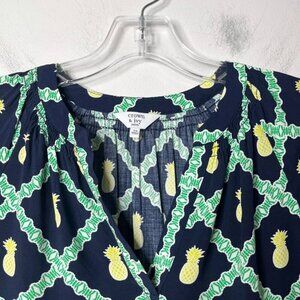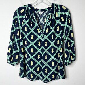 Crown & Ivy Women's Peasant Top PS Pineapple Print Navy Blue 3/4 Sleeve Blouse