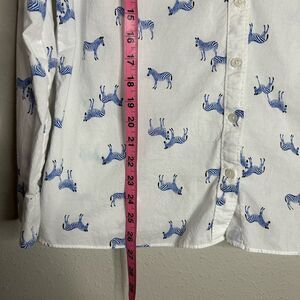 Women’s long sleeve button down shirt from Crown & Ivy. Blue and black zebra print on white. Button cuffs. Size XL. See photos for measurements. One small mark on back right shoulder (see last photos) but otherwise on good preowned condition.
