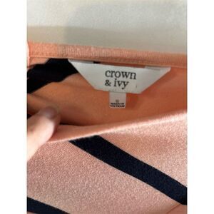 This Crown & Ivy bell sleeve dress in Size S features a multicolor striped pattern and a knee-length design. Made from a blend of cotton, modal, and spandex, it offers a comfortable fit with a scoop neckline and 3/4 sleeves. Ideal for casual spring occasions, this dress is machine washable for easy care. Pre-owned condition.