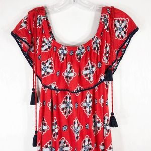 Crown Ivy XL Petite Dress Red Blue Tassels Shift Knee Off Shoulder Pineapple 574
