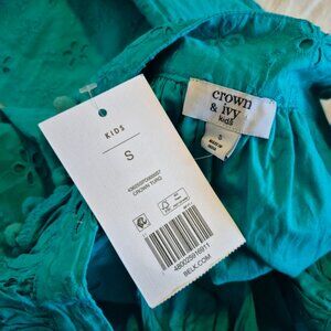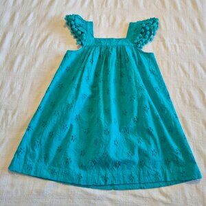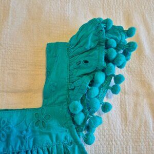 Crown & Ivy girls size small or 7 turquoise lined dress tunic with cutout flowers, pom poms on cap sleeve NWT
