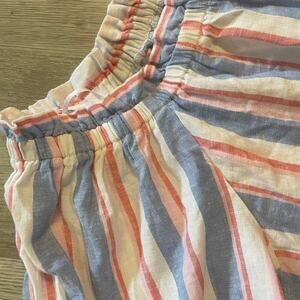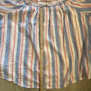 Crown & Ivy striped blue, pink/coral, and white, off-shoulder top size large. This top features and off-shoulder design with a ruffled, elasticized neckline and smocked accents, characteristic of a peasant or bohemian style.