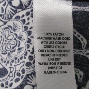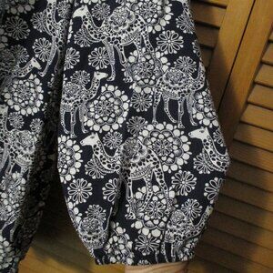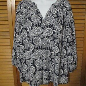 Crown & Ivy brand - V neck top with 3/4 length sleeves. Top is soft, lightweight & flowy. Colors are navy blue with white floral and what look like camels. Gathers of material around the shoulders and back neck area. Great condition.