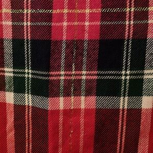 Fully lined Red, blue, green, white and gold plaid Tie back at the neck