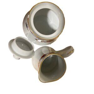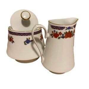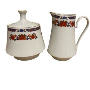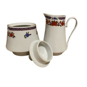 The Regent Collection Crown Ming Fine China Sugar Bowl & Creamer Set. This beautiful white set is adorned with red & blue flowers and gold detailing around the rims and handles of each piece.