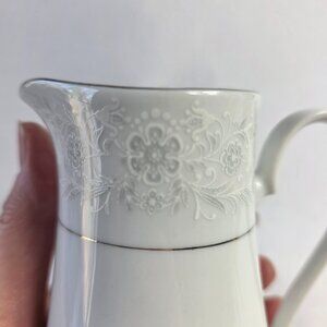 For sale is ONE (1) Crown Ming Queen's Lace Creamer. The creamer is white with white flowers and platinum trim. The cream is in good used condition with no chips, cracks or crazing. I have many other pieces from this pattern