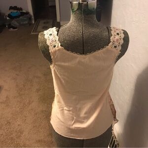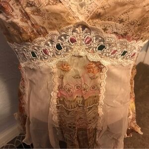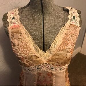 Bohemian style top with lace and patchwork design. Features a mix of cream, tan, and pink colors. Pit to Pit is 16 inches