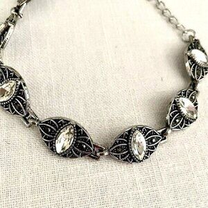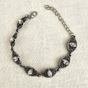 • Featuring white marquise rhinestone centers, silver studded floral frames are dotted with dainty hematite rhinestones as they link around the wrist for a regal flair. Features an adjustable clasp closure.