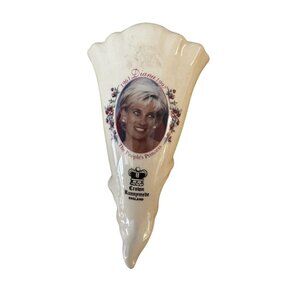 Elegant commemorative wall pocket by Crown Runnymede, England, honoring Princess Diana (1961–1997). Features a color portrait of Diana framed by pink and green floral garlands with the words “The People’s Princess.” Cream ceramic body with scalloped edge and glossy glaze. Includes hanging hole on back. A collectible tribute to one of the most beloved figures of the 20th century.