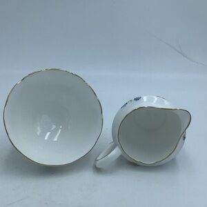 Crown Staffordshire fine bone china creamer and sugar rimmed in gold and featuring dainty flowers. Made in England. Perfect for afternoon tea. Pre-owned, good condition.