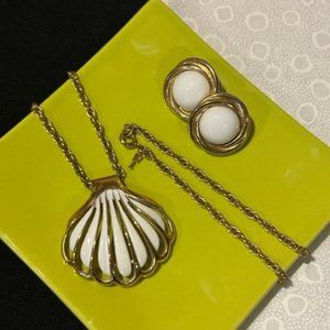 🏖️Crown TRIFARI Gold White Enamel Shell Pendant Necklace with Earrings