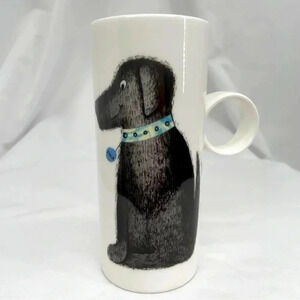 This adorable tall, thin mug features a cute black dog on one side and a black & white spotted dog on the other side
