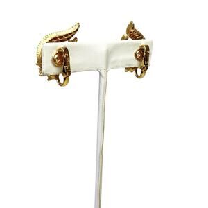 Crown Trifari Clip Earrings Clear Rhinestones Bright Sparkle Swirl Leaf Gold Tone