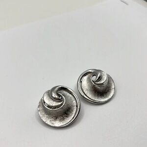 This is a pair of Crown Trifari matte and polished swirling silver-plated clip back earrings. The earrings measure 1" in diameter and are signed TRIFARI with a crown over the T on the clip. These earrings are featured on page 181 of "Signed Beauties of Costume Jewelry: Identification and Values" by Marcia Brown and published by Collector Books of Paducah, Kentucky in 2002.