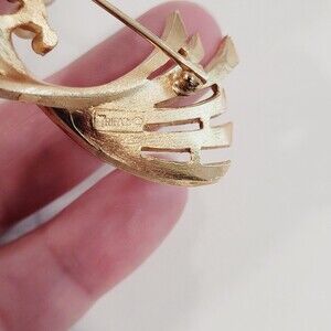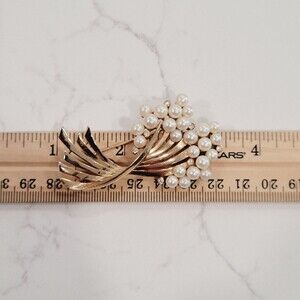 Vintage Crown Trifari Faux Pearl Rhinestone Swirl Brooch Gold Tone Cluster Bouquet MCM 1960's Midcentury modern. Good pre-owned condition with normal color wear/scratches consistent with age. See pics for approx measurements and details.