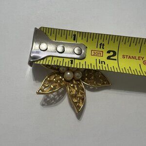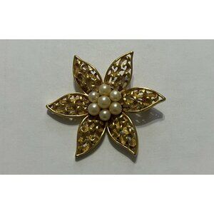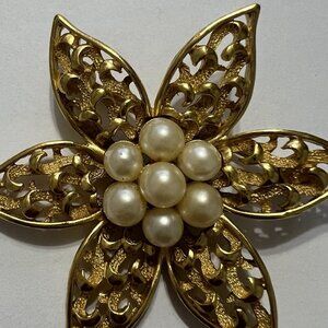 Crown Trifari Gold Tone Floral Faux Pearl Cluster Center Brooch