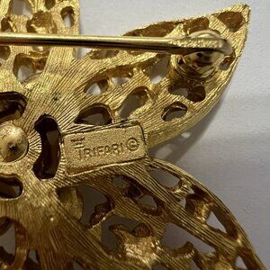 Crown Trifari Gold Tone Floral Faux Pearl Cluster Center Brooch Signed