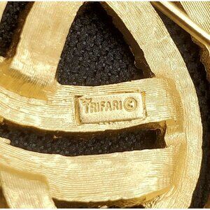 This stunning Crown Trifari brooch pin features a unique knot design with a textured infinity pattern in a beautiful gold tone. The brooch is perfect for those who appreciate beauty, art, and dressy accessories. This piece is a must-have for any fashion-forward woman who loves vintage jewelry.