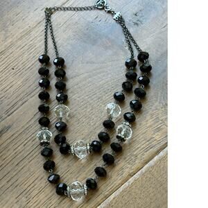 Crown Trifari Multi Chain Silver Tone Black & Clear Beaded Crystal Necklace