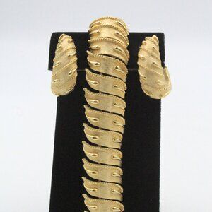Crown Trifari Signed Designer Brushed Modernist Gold Tone Bracelet Earrings Set