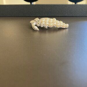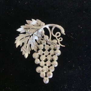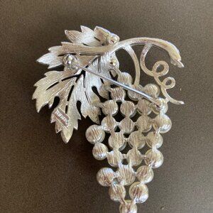 This vintage Trifari brooch pin features a beautiful cluster of faux pearls in a silver tone setting. The stunning piece is perfect for any occasion and adds a touch of elegance to any outfit. The brooch is designed with a grapevine pattern and is ideal for those who appreciate vintage and antique jewelry. The brand is well-known for its high-quality pieces, making this brooch a great addition to any collection.