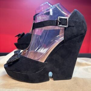 Crown Vintage, Black 5.5” Wedge Heels with 1.5” Platform. Faux Suede With Basket Weave Bow. Women’s Size 10M. Pewter color buckles. Cupped heels. Ankle straps. Excellent preowned condition.