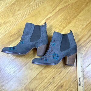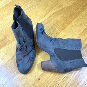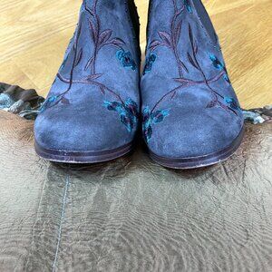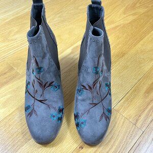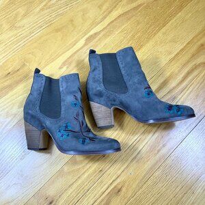 Beautiful faux suede ankle boots, pull on elastic sides, gray with blue multi embroidery and studs