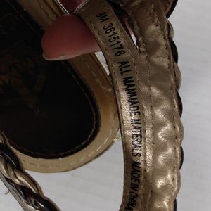 Used good condition. Super cute strappy brown & gold metallic wedge sandal with 3 inches heels. Upper material made of fabric.