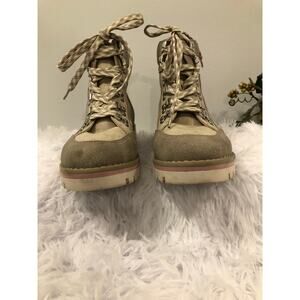 These boots feature a beige faux suede upper, a lace-up design with metal D-rings, and a lug sole with a subtle pink detail. The boots are described as a classic hiker style.