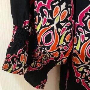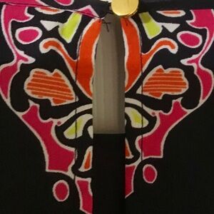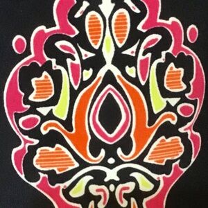 - Attractive Indian-inspired , geometric print in hot pink, orange and yellow pops against a navy background