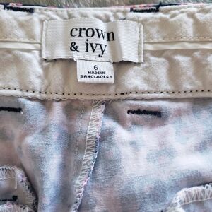 A pair of pink and navy blue patterned Crown & Ivy shorts. Two front pockets and two back pockets (back not opened yet) and they are very cute!! 5" inseam. Bought these on posh but they didn't fit.