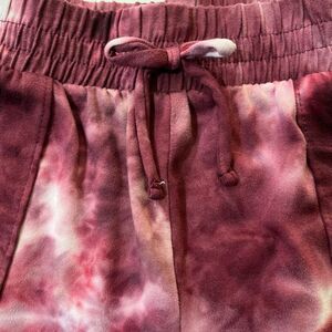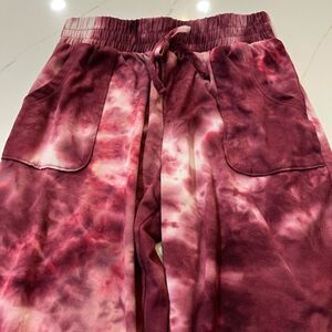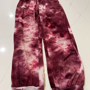 Trendy tie-dye joggers in rich burgundy shades. Perfect for casual wear.