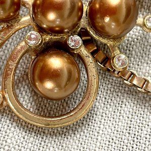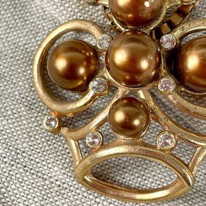 Vintage 1950s goldtone brooch crown brooch with mid century atomic styling. Ornamented with faux brown pearls and crystals. Unmarked by the maker.