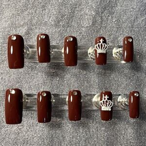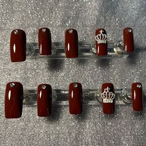 Hand designed gel press-on nails. Simple look includes 14 nails with clear rhinestones and silver tone 3-D crown design on each hand. Comes with mini nail file, cuticle pusher and glue. See photos and video for details.