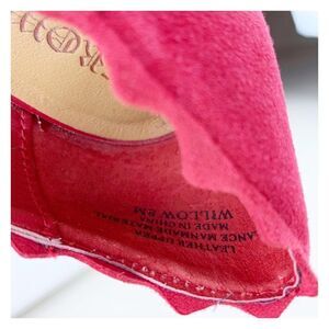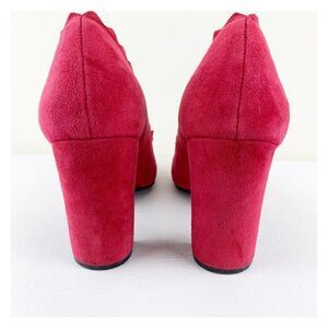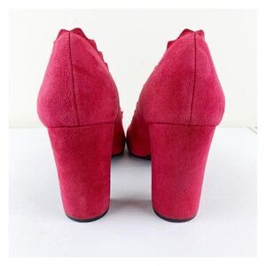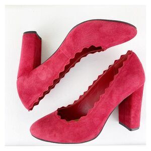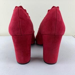 Crown Vintage Scalloped Edge Willow Chunky Heeled Red Suede Heels Sz 8M. A spot or dent here and there as shown, but hardly noticeable when worn. 3.5” suede wrapped heel. Please see photos for additional details.